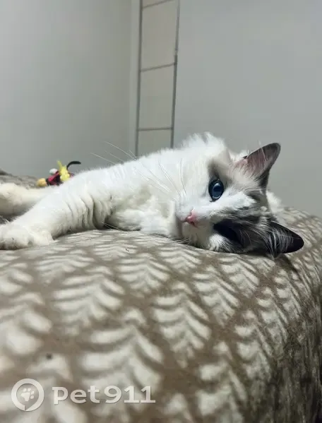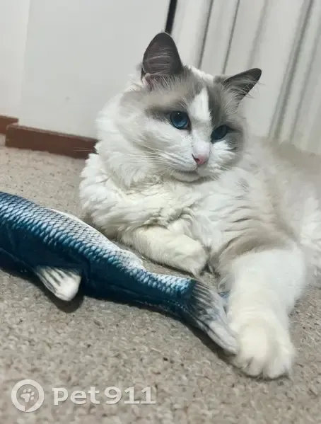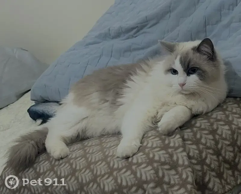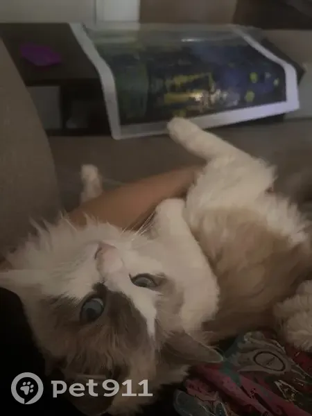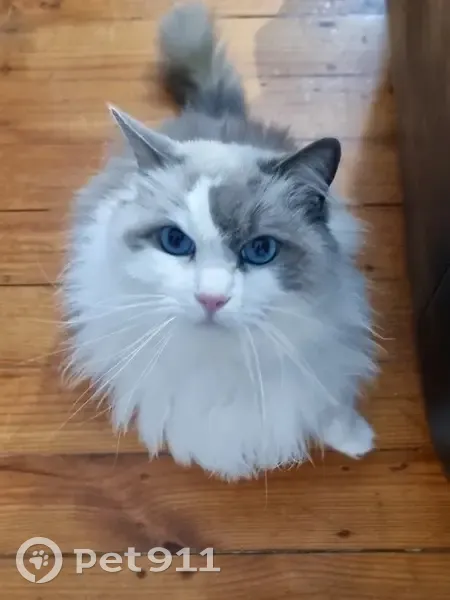 Ragdoll breed Fluffy White and grey coat Big blue eyes Name is Popcorn but he also answers to Poppy Indoor cat, who I believe jumped on the top of my backyard fence to go exploring and is now missing