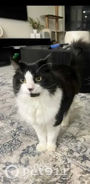 Black and White cat. Has yellow eyes. Disappeared while moving out of the house. Does not wear a collar. Is microchipped and desexed. Is an indoor cat.