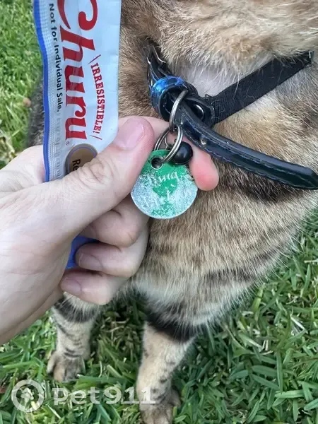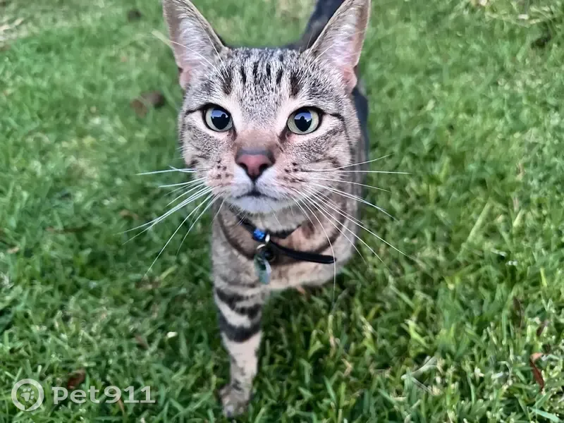 A friendly tabby cat has been coming to my yard. The cat is wearing a collar with a tag, but the writing on the tag is too worn to read the phone number clearly. I believe the cat might be lost and hope to help find its owner. The cat has: • Short brown and black striped fur • Bright green eyes • A black collar with a small tag and bell If you recognize this cat or know who the owner might be, please contact me. I just want to make sure this lovely cat can return home safely.