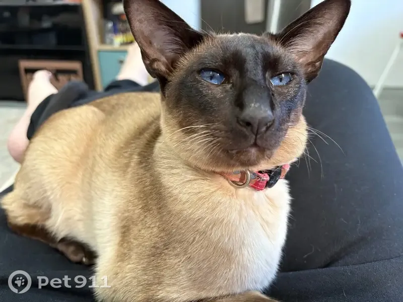 Wedge head seal point Siamese. Her ears, face,tail and paws are chocolate with her body being light brown. She has a small scar on her nose. Her eyes are ocean blue and she is wearing a black collar with glow in the dark moons and stars. She is extremely friendly but can sometimes be scared of strangers.