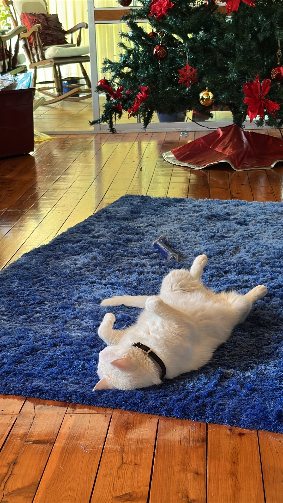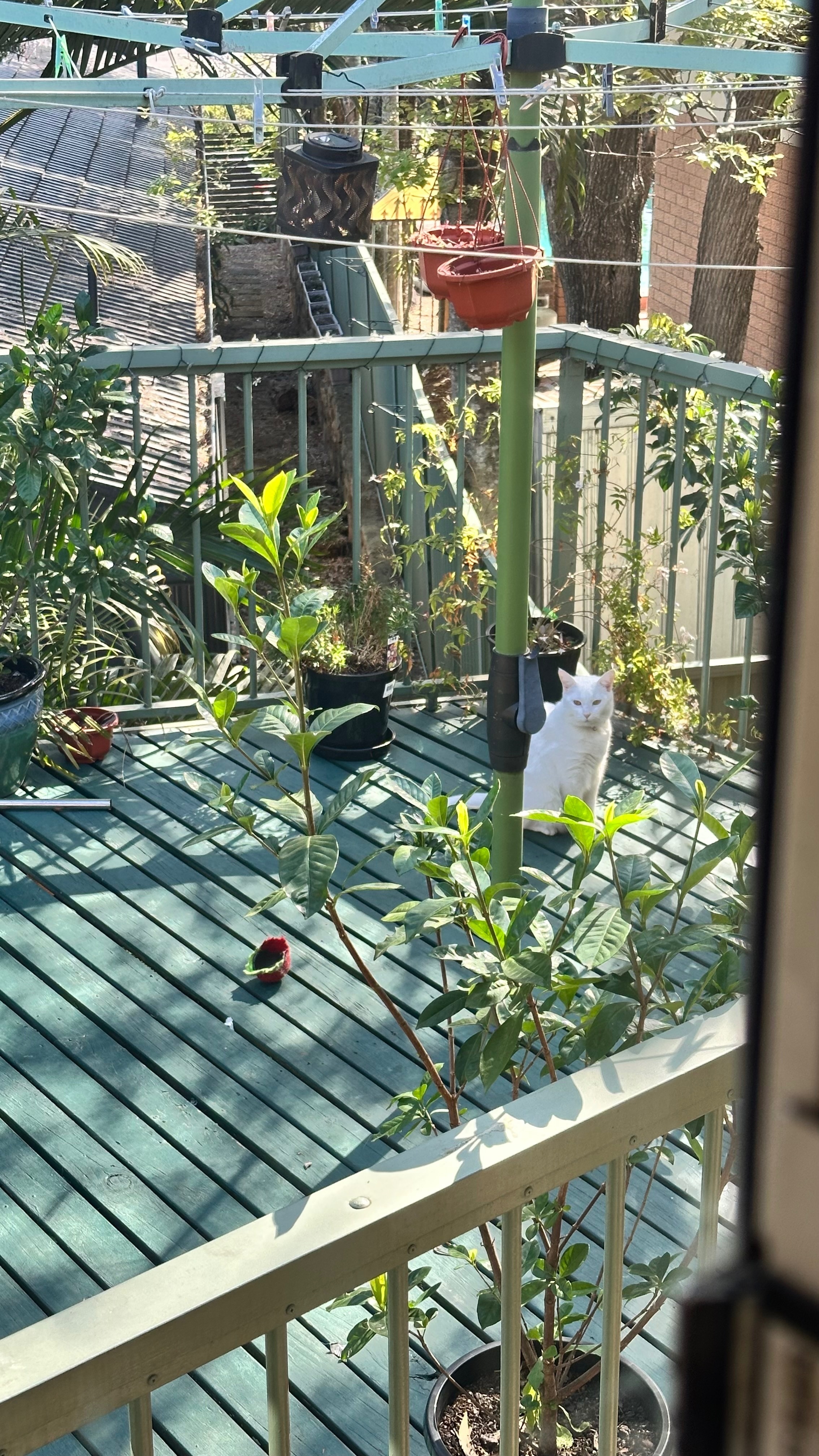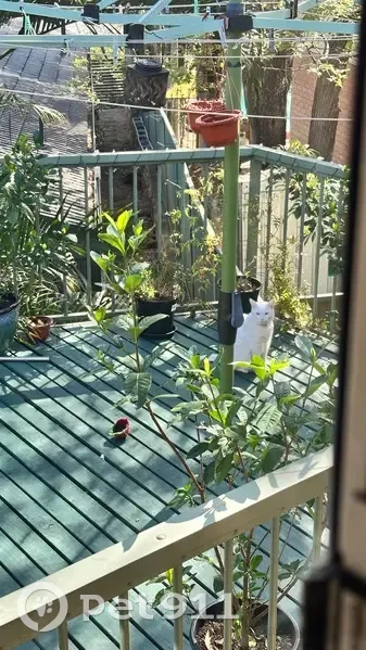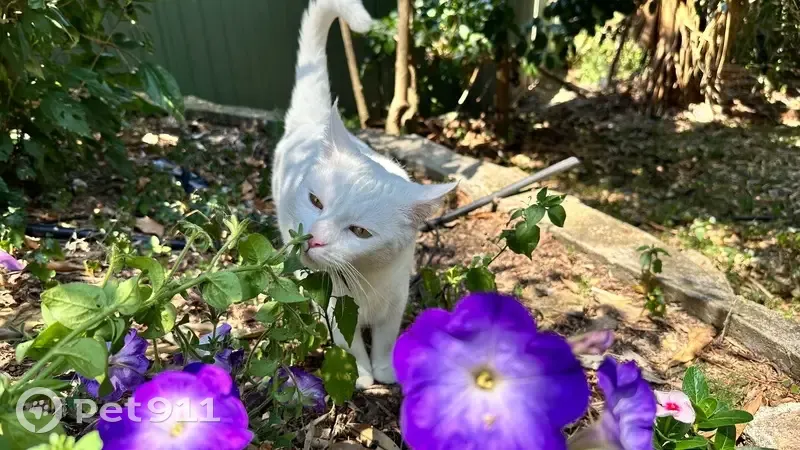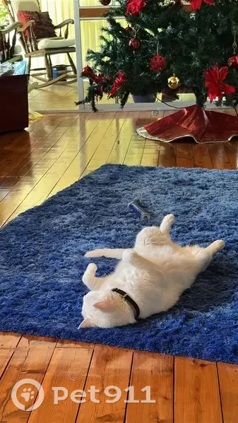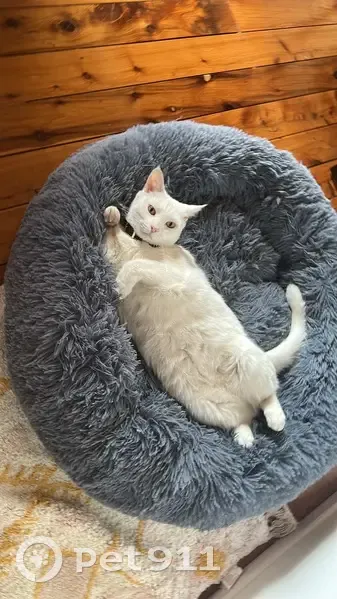 He’s full white coat with pumpkin colour eyes. He’s friendly but shy and gets along with other cats. Sits around and does like to climb a bit and sit in bushes. He’s microchipped and neutered, he was at a pet sitters house but escaped through a window, so unsure if he had he’s harness on at the time(was a blue harness)