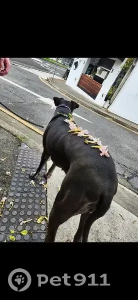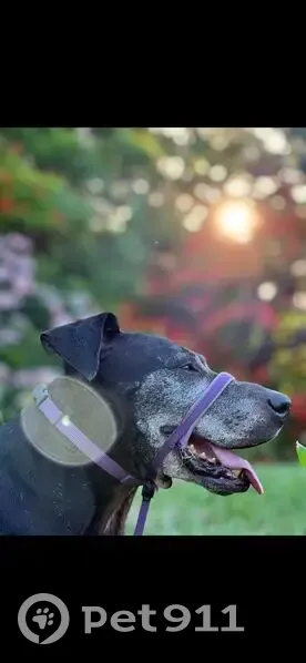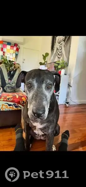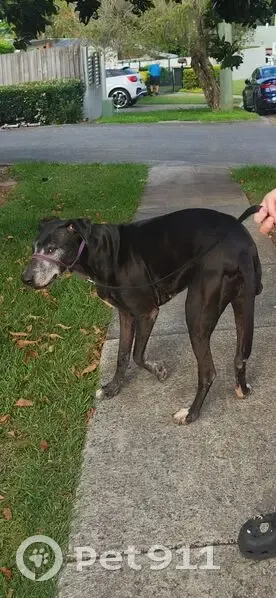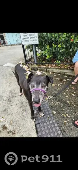 Shes a big black dog white patch on her chest and toes and tip of tail, she is starting to loose her little front teeth, she has skin tags on her belly and a big one on her back right leg like a lump
