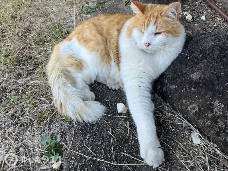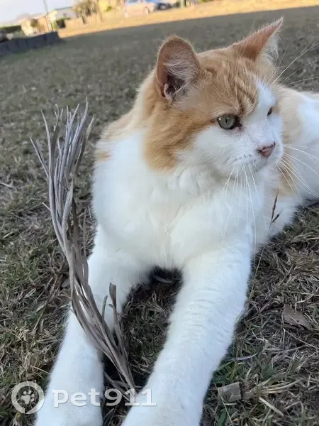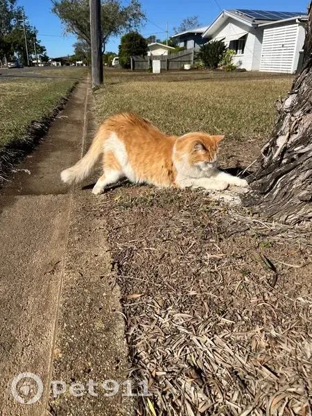 Orange and white fluff ball .. He’s 17 years old has knocked wokkey back legs due to an accident as a kitten n that’s how they healed he also has arthritis in both back legs which he has medication for… he’s a Smoochie boy who loves attention n belly rubs but can be timid n take off if he don’t know a person.. He’s avoids dogs and other cats is road savvy… he usually stays put wen outside throughout the day unless I walk him … never goes far at all and is always around every afternoon to cone in for the night and especially dinner.. So out of character for him to not be here.. Sleeps most of the day .. But does love boxes open garages loves to explore but normally would never do that without me present.. He’s a very good boy… I just want him home he’s my big baby n my little female baby girl is missing him terribly too