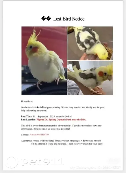Lost and found pets Australia, photo: Lost Tame Bird: Help Find in Sydney!