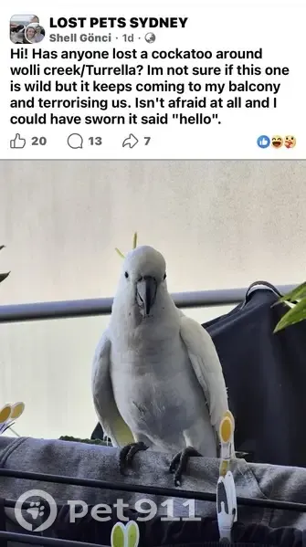 Lost and found pets Australia, photo: Found bird, Turrella Street, 104, Mascot - Cockatoo White and speaks