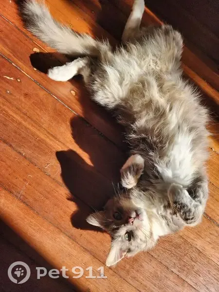 Grey and white. Brown and grey on top side.. White and grey underneath. 4 white feet Fluffy tail Unusual for him to be away from home any longer than 2 days.. High street, Greta.. Please help me find my boy