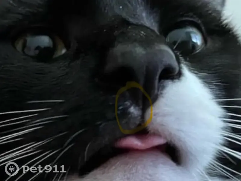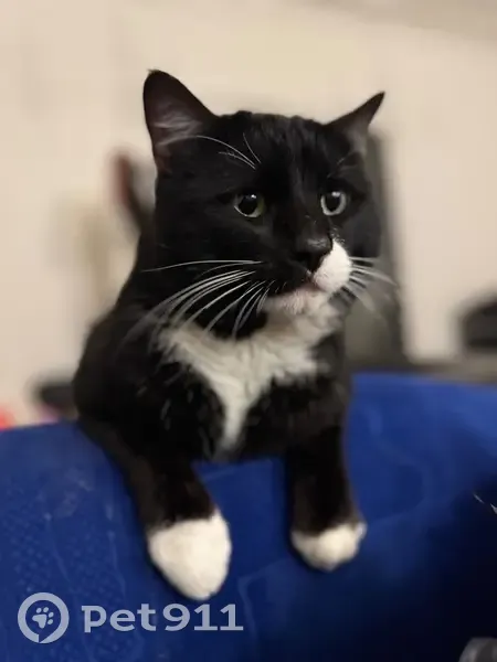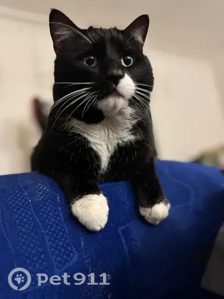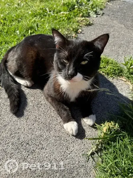 Black & white tuxedo cat • Black nose with white mouth/chin • Small noticeable mark/scab next to his nose • Green eyes, slim build • White chest and white paws (like socks) • Not microchipped and not desexed • Usually friendly but may be scared and hiding