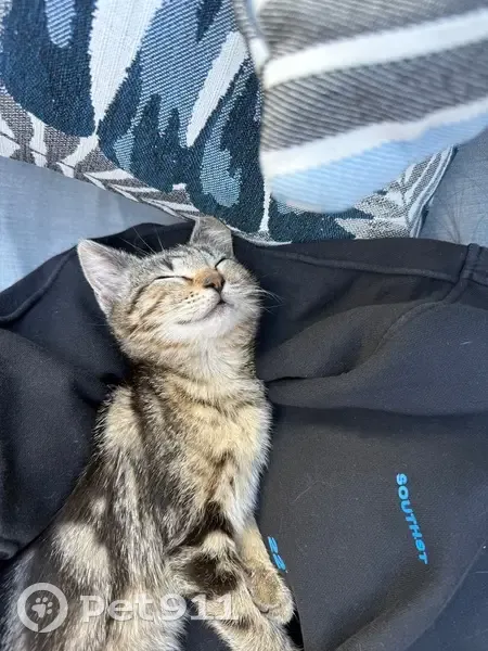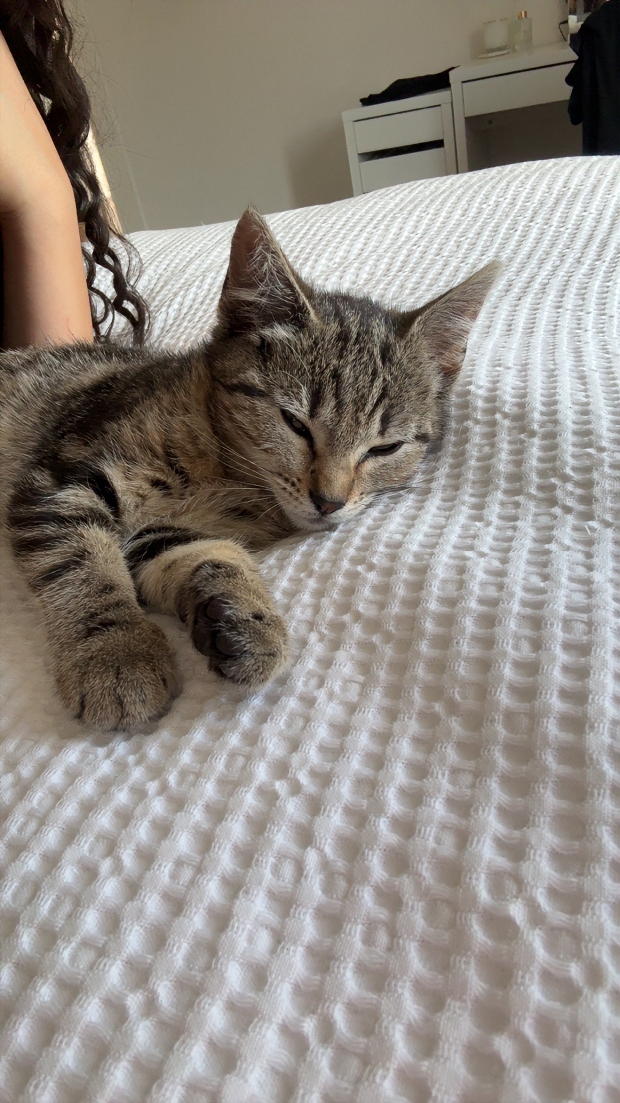 She is only 3 months old, a kitten. She is tiny. Haven’t had the chance to desex her or microchip her yet as I got her very recently. She is grey with black stripes down her coat. She is my baby sisters cat