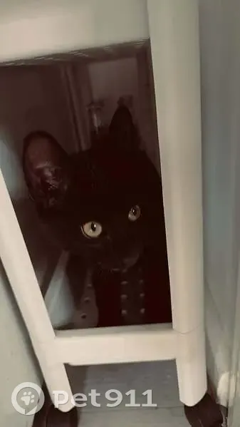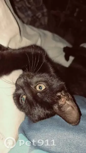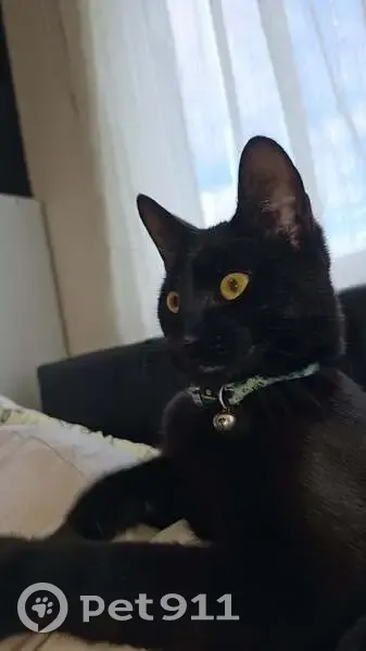 Hes black, skinny, long has slightly bige ears, yellow eyes, hes only young no older the 6 months, hes wearing a blue collar with a bell that has little fish on it. Hes friendly has a higher picth meow.
