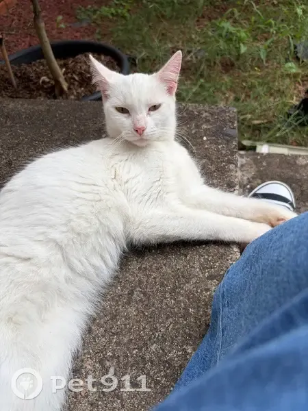 White female cat. Yellow eyes. Friendly and sweet. No collar. Is microchipped and the vet is trying to contact the owner. No response just yet. Info says she’s about 4 years old.