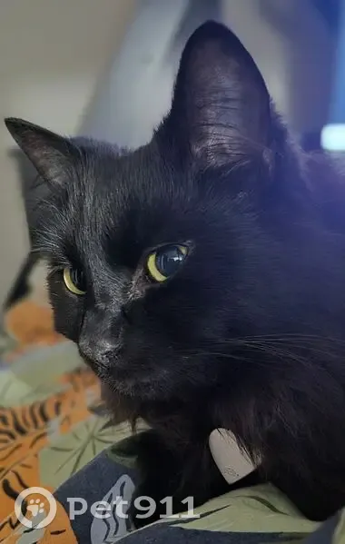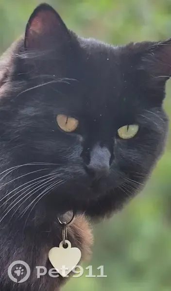 Black cat with medium length fur. She was wearing a blue collar witha heart shapped tag with her name and number on it. She has greenish yellow eyes. She is 4 years old. Her fur looks dark brown in the sunshine.