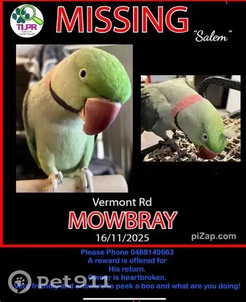 He flew off towards bill Grove. He has a gold band around foot. Is very friendly and speaks . He repeats peek a boo and what are you doing. He also says mom.