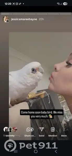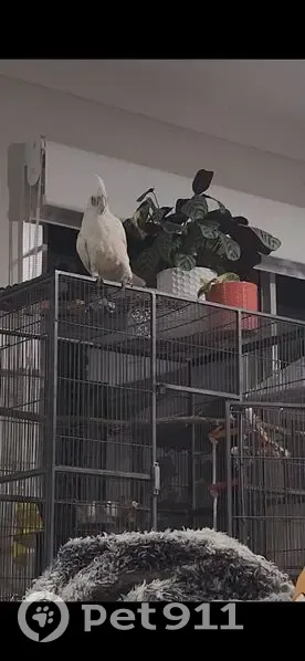 Baby took off in a panic flight after a strong gust of wind spooked him. Baby is a loud screecher and was learning to talk when he went missing so he makes a lot of gibberish high pitched squealing sounds. He steps up onto your hand when prompted and won't eat anything but seeds