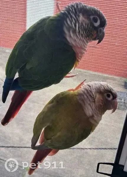 The cage was left open and both of them unfortunately flew away. One of them has a grey head while the other has a black head. They both have a green body coat with blue wings. Both they're tails are red