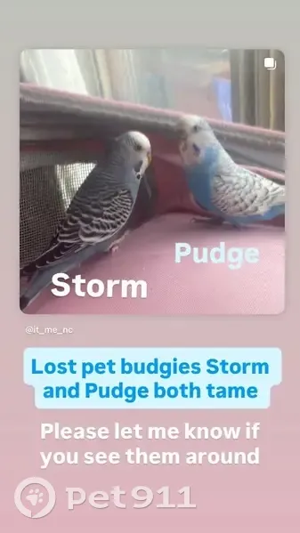 My budgies Pudge and Storm are somewhat tame. Pudge blue white and black stripes, loves spinach, will knock on the cage to get out, it will step up on your finger if you ask. Storm is a big budgie, dark navy, grey and white with black stripes. Won’t easily trust people, always freezing when picked up, quick flying bird.