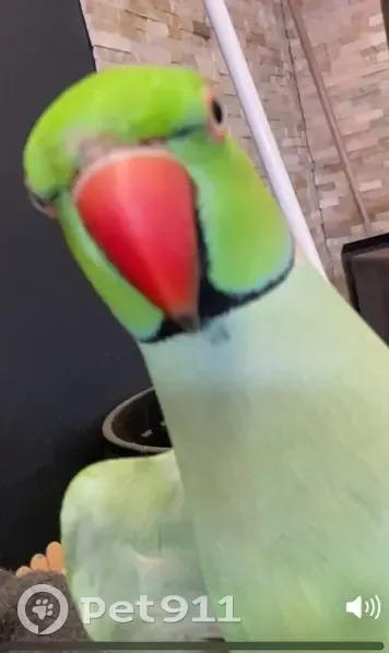 He is a vibrant Green colour with a black ring with orange on the back of his head / continuation of the ring. He talks and says G’day mate. How’s it goin. He is 7 years old and a much loved family member. He can also whistle the “clown song” if in the mood. He flew out above my husbands head through our sliding door. It was very windy so I think he got a freight and flew off. Has been known to fly onto you and is very tame. Loves apple and cuddles