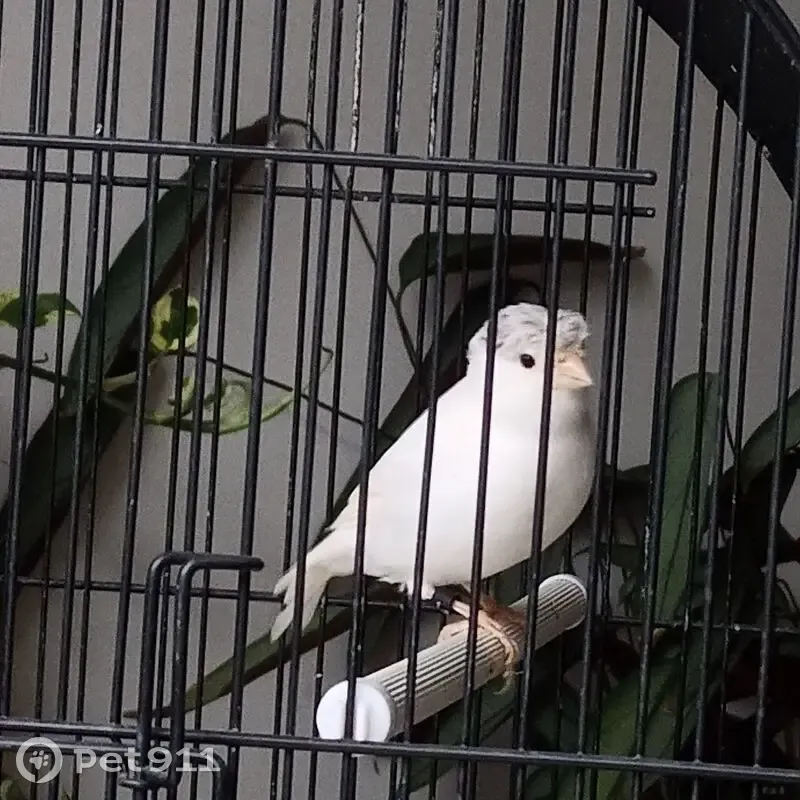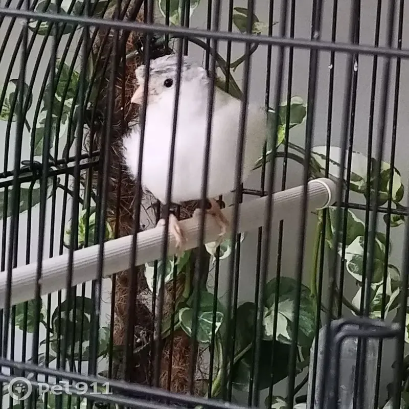 Completely white with a grey patch of feathers on head. Very young canary. Gender yet to be determined due to age. A cat knocked over the cage and Shima escaped. Initially stayed on the fence line but a passing bird spooked Shima and he/she took flight and flew into neighbouring properties. We chased after he/her for a block or 2 but lost her around Devonshire street.
