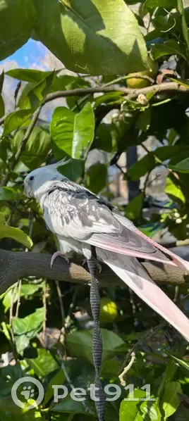 Juno is white with grey flecks, has pink thru her tail feathers and a small brown mark on her head. She is very tame and today is the third day since she flew away accidentally from Gallasch Drive Mt Barker