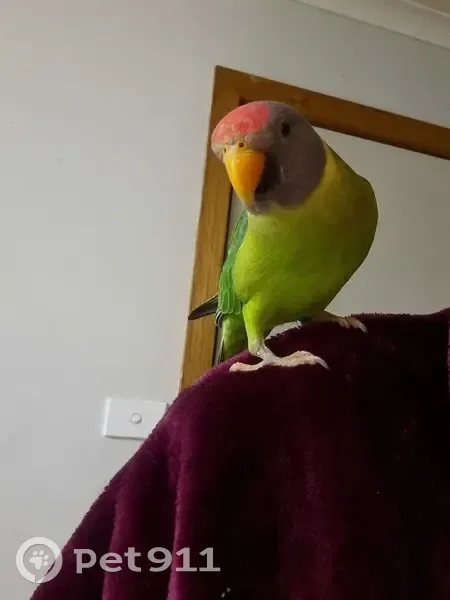 Skittle is a 2 yr old plum headed parakeet (parrot) his pink colouring on his head is only partially through. He talks a lot and says "wheres the bird, gimme a kiss, cheeky boy, youre naughty, are you okay, wheres monty" and so many other things. He loves lorikeets and mimics them all the time. Hes wearing a green band on his left leg but i have lost where ive written the number down. Skittles cage door was found open and I'm guessing he got out through the kitchen window which was open.