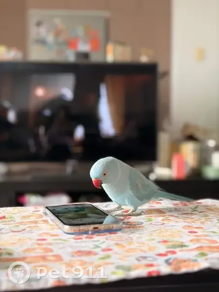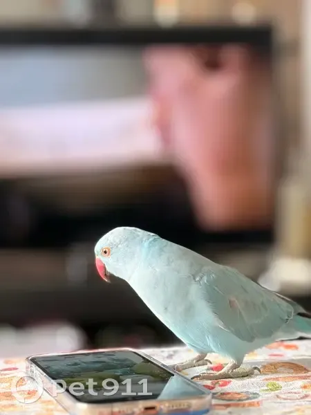 Flew out of a window. He’s pretty young. Has not yet developed ring neck. He can talk a little bit and say peekaboo. He will likely bite if approached but is attracted to phones.