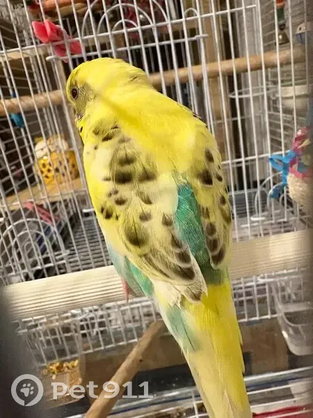 Top half of budgie is yellow while the bottom half is blue/green. Sweet loving bird but can get scard of strangers. Very small and loves seeds.