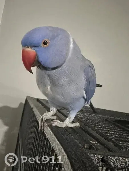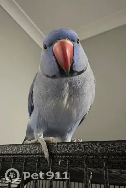Blue coloured Indian Ringneck parrot. His ring is about 3/4 of the way around his neck. I opened his cage this morning to put fresh food in and he flew out and out the back door that was left opened .