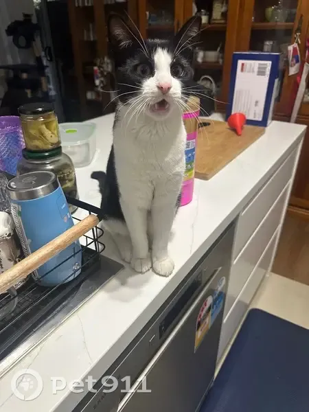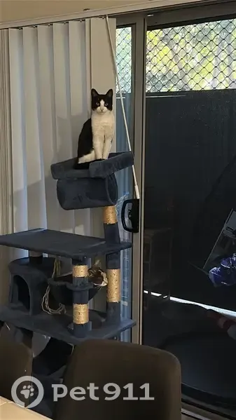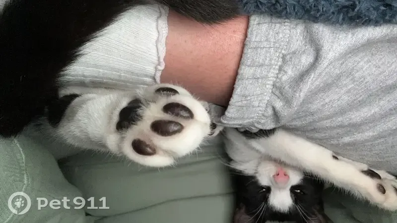 Black and white 7 month old kitten, he has black paw pads. He is very friendly and loves to cuddle and be pat, he may run when approached as he gets a little shy. He is not microchipped.