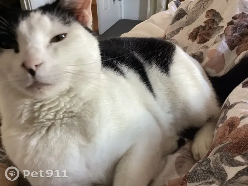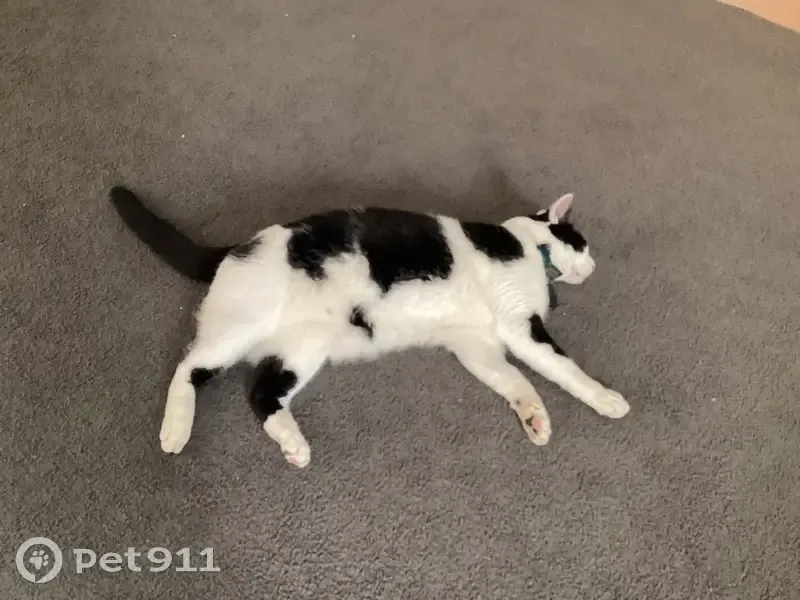 Black and white ( black tail, a few black patches on the back , greenish/ aqua coloured colour with bell (may be lost). May be scared of people . 4-6 kg