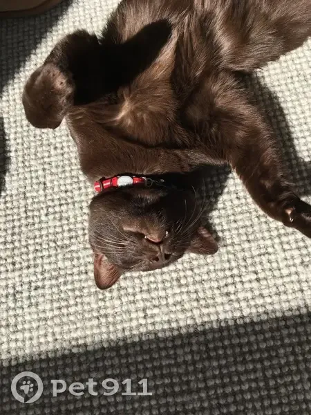 Brown burmese cat yellowish green eyes, soft silky fur a bit fluffier around the neck, he has two little shaven bits one on his leg and one on his neck (i think so, they might have grown out)