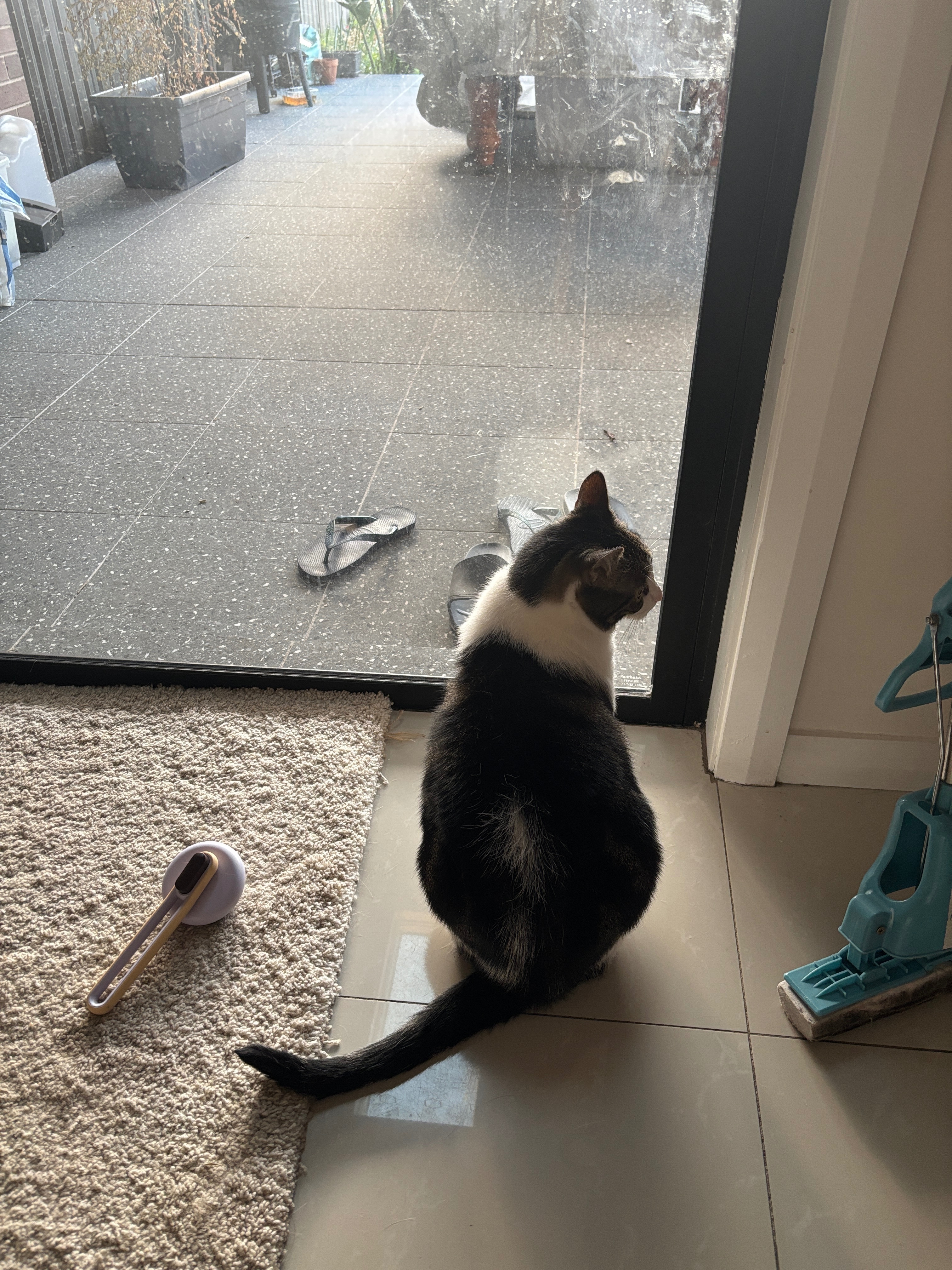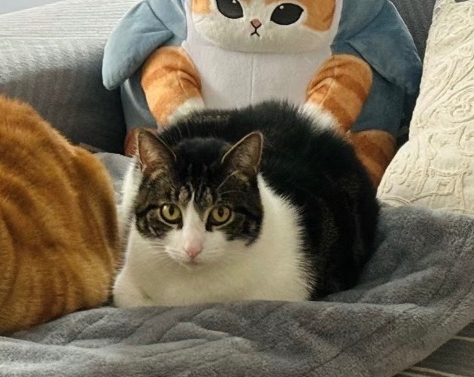 Tabby short hair, Black body and white around neck and breast, large in size (7kg).