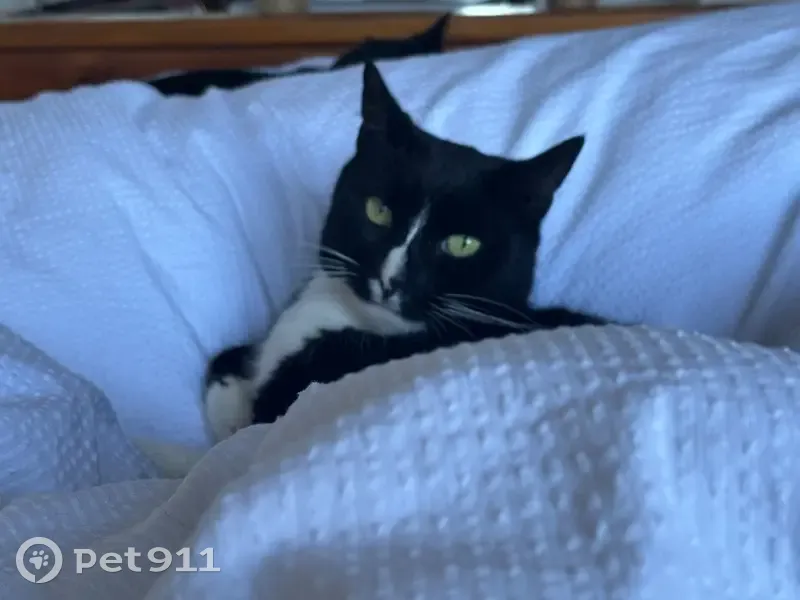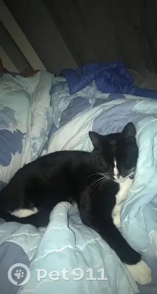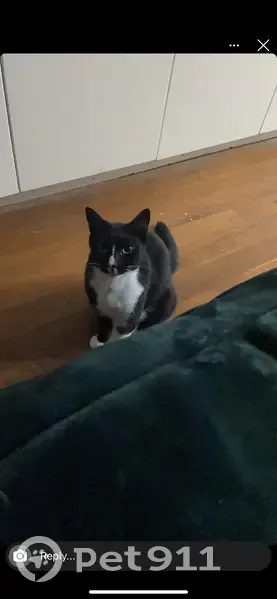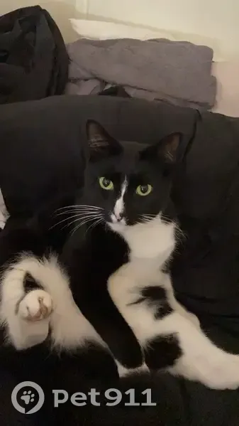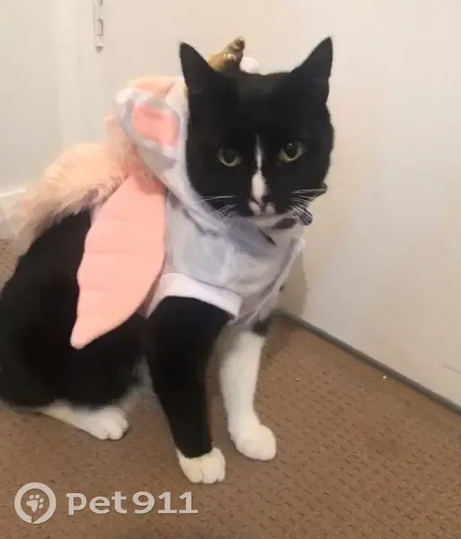 She has green eyes, has resting cranky face, nose is pink and black, white chin, going up into line, through the nose and ending just above her eyes. She’s very antisocial, so she’s not gonna come if you approach her but she might come if you have food and are crouched away from it.