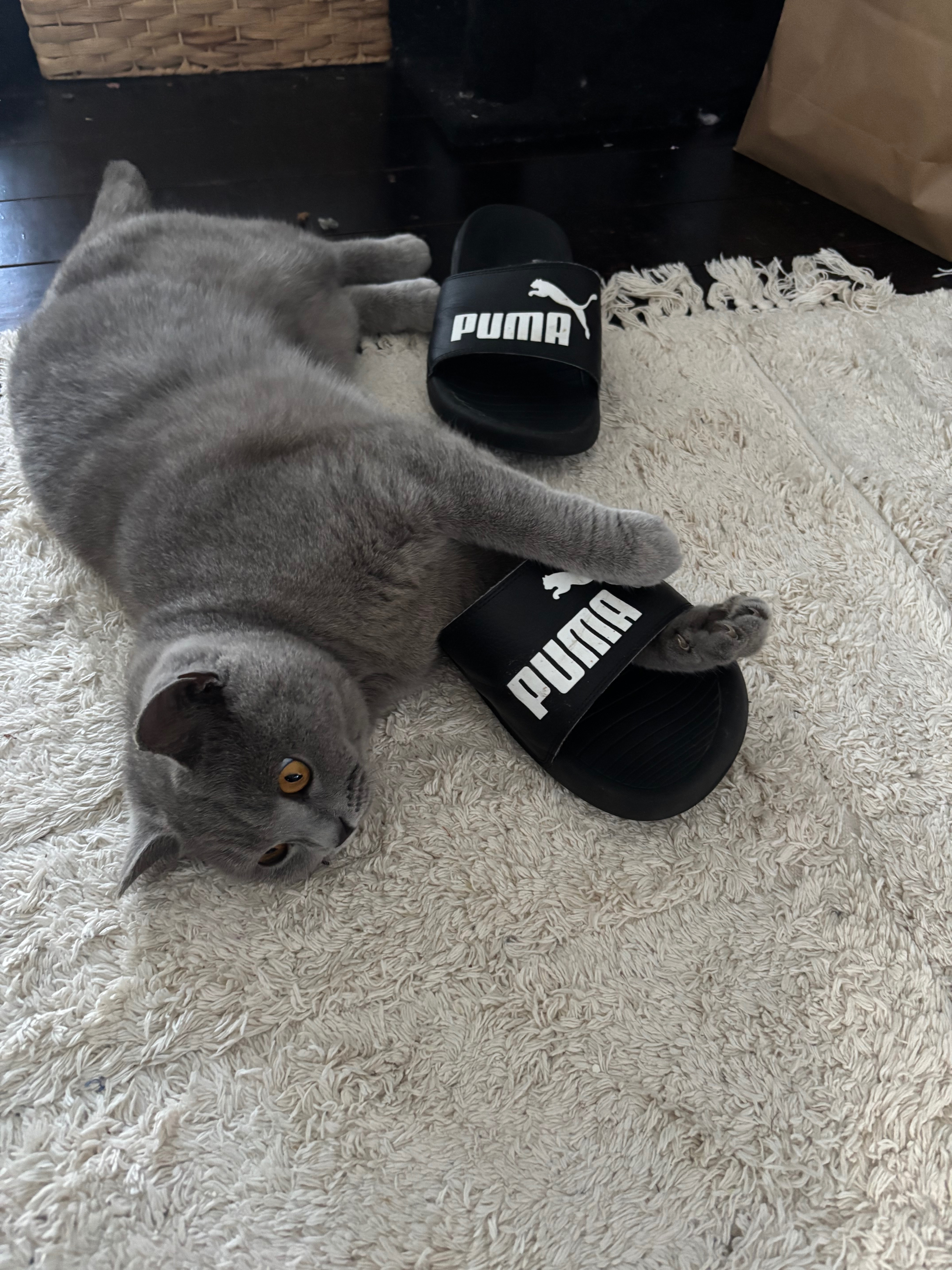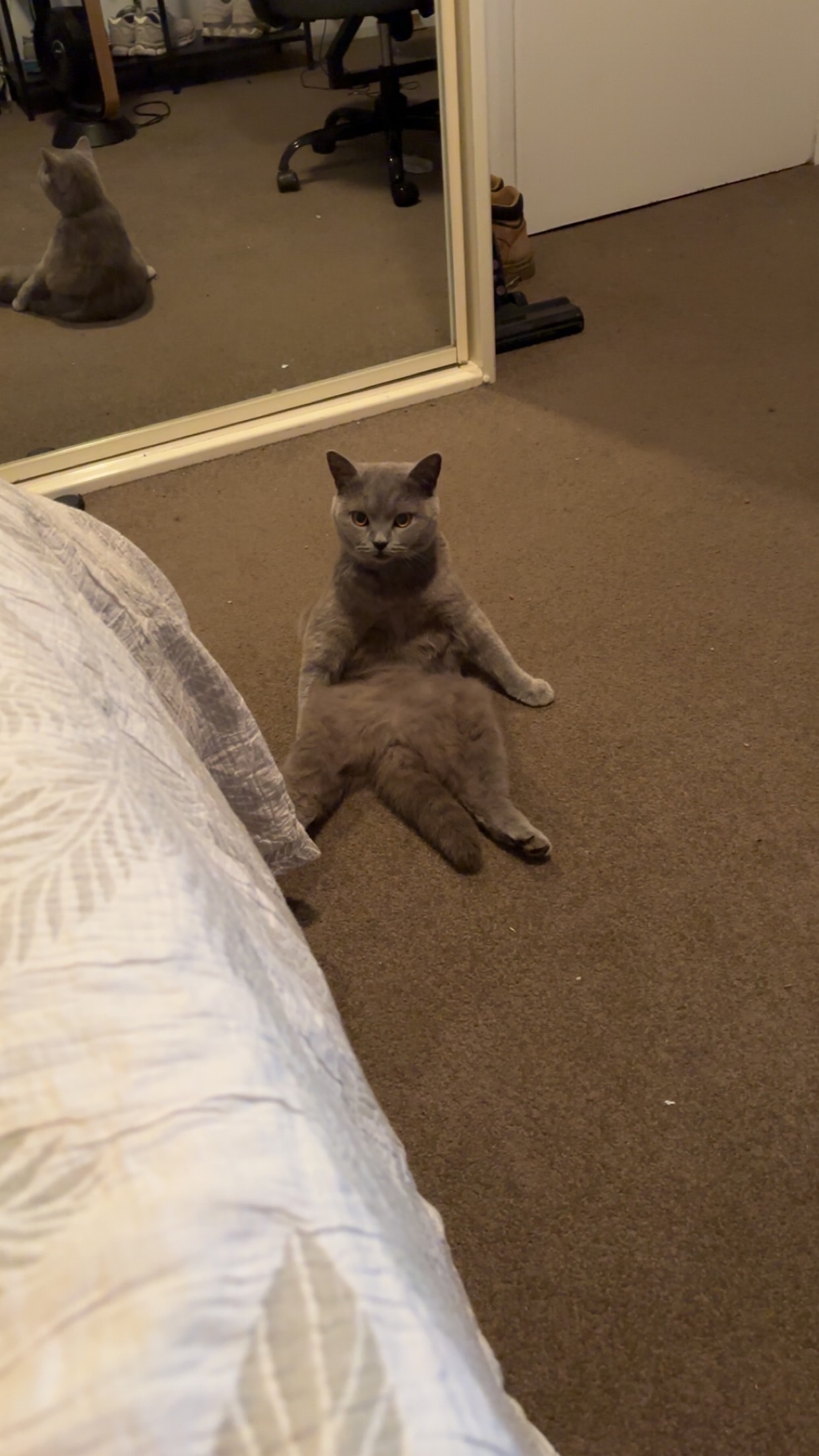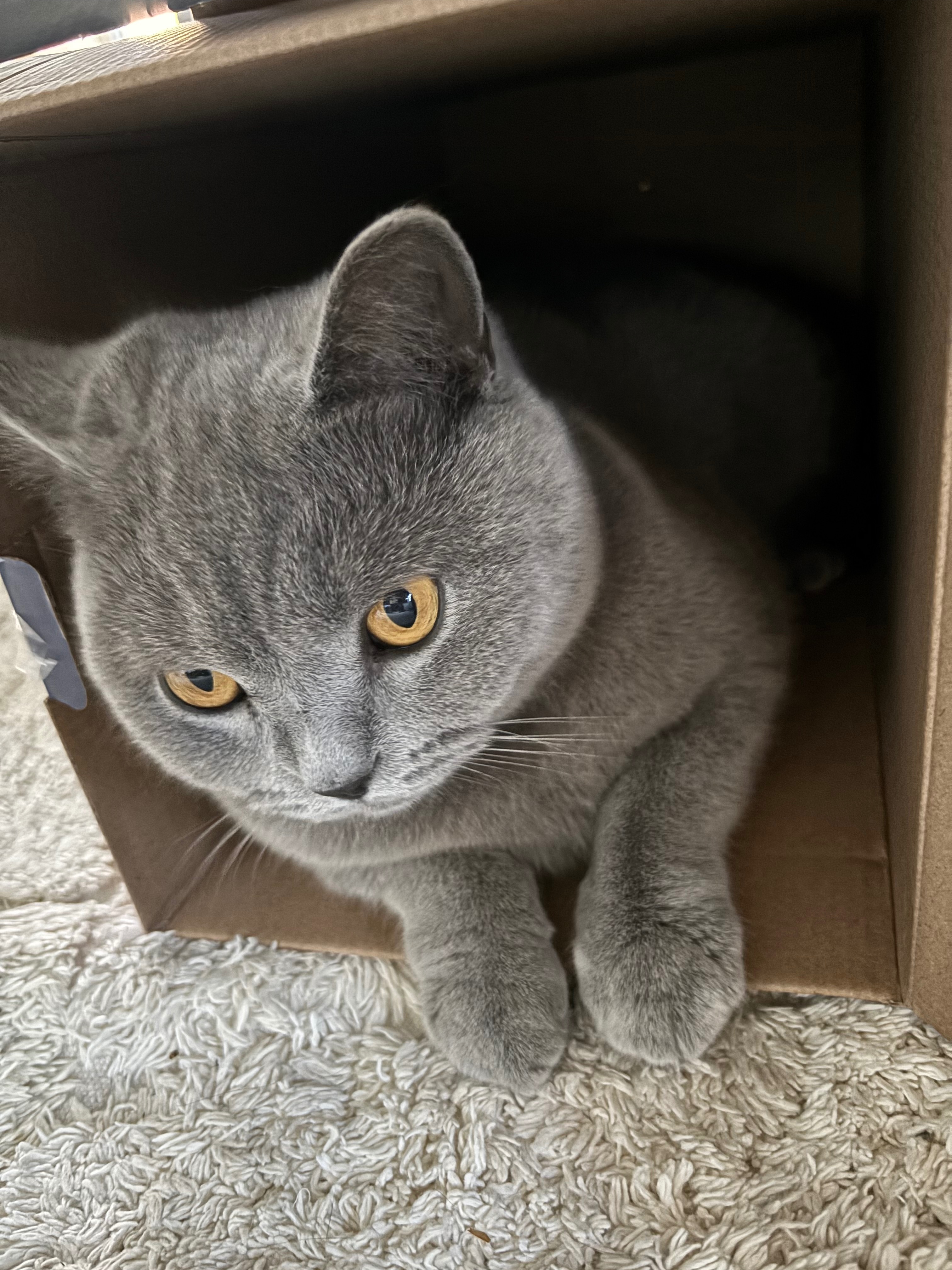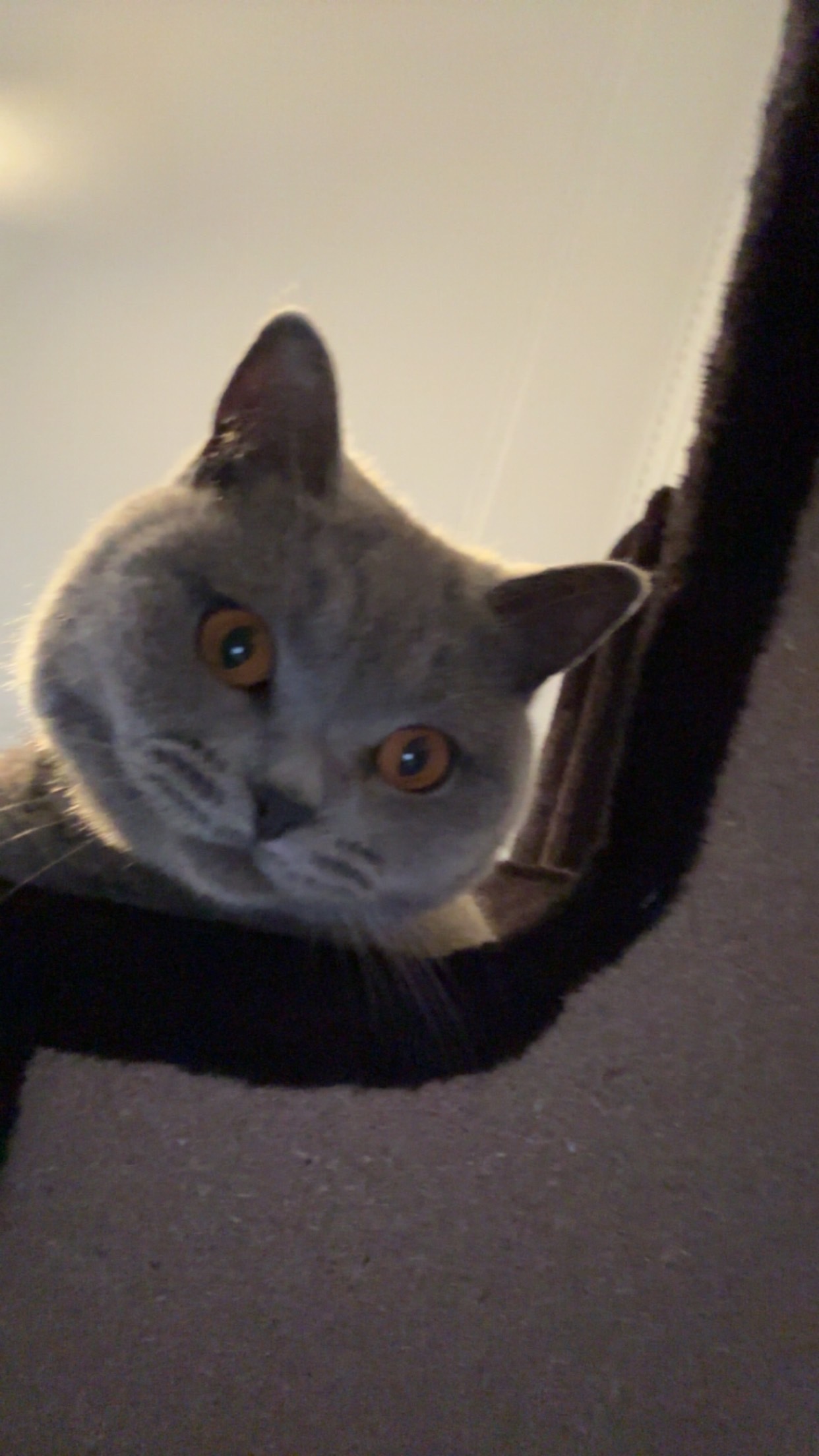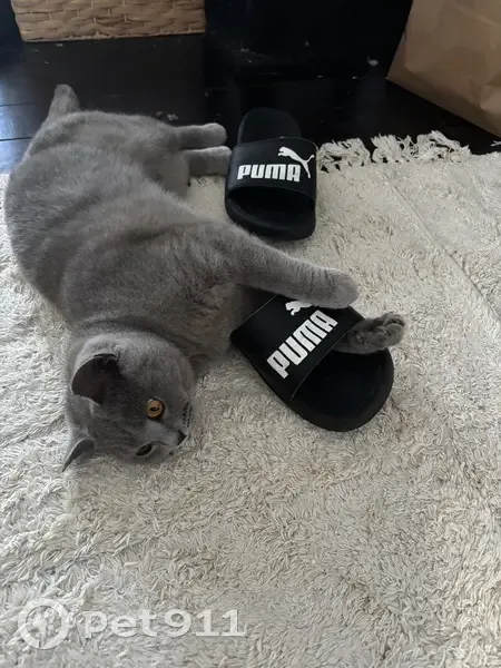 Grey British short hair with dark grey stripes about 4kg, orange eyes, ran off with her leash and collar still on, collar is yellow and black and the leash is black.