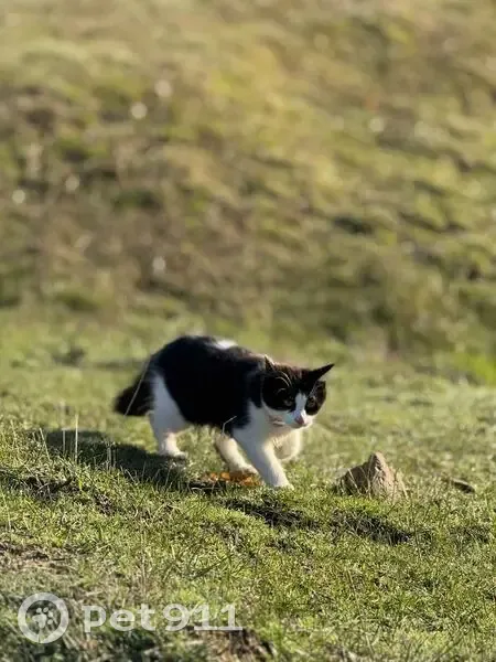 She’s only 8 months old, black and white (tuxedo style), with big green eyes, a pink nose, and soft fluffy fur. No collar, but she has a microchip registered.