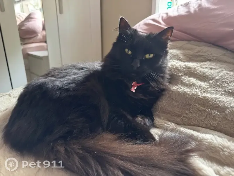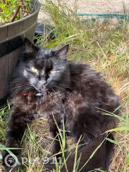 Microchipped, desexed and registered. Long fluffy fur, dark chocolate brown/black. Pink collar with a pink fish and air tag. Friendly sometimes skittish to people. Seen in the morning then missing for the rest of the day, it was a hot day and it was the day of the fires so a bit smoky.