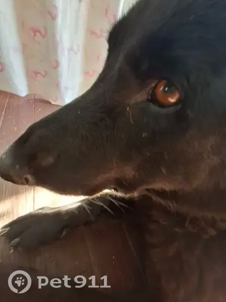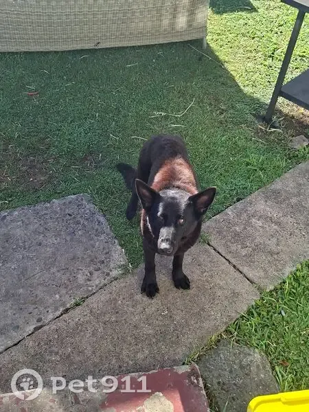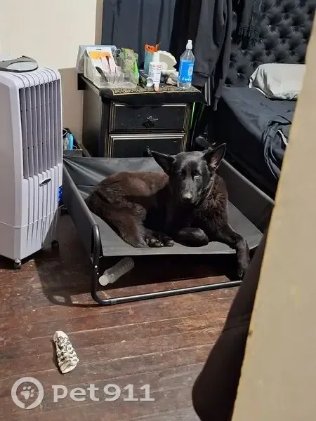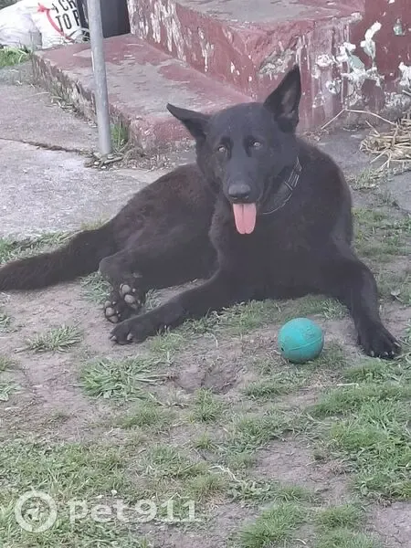 Raven is a female, purebred, 6 year old black german shepherd. She's a medium-slim build with most of her teeth worn down except her molars. She is wearing a black mesh padded collar, a black harness with a grey reflective strip on both sides and a very heavy duty black rope leash with a plastic handle with moulded finger grip