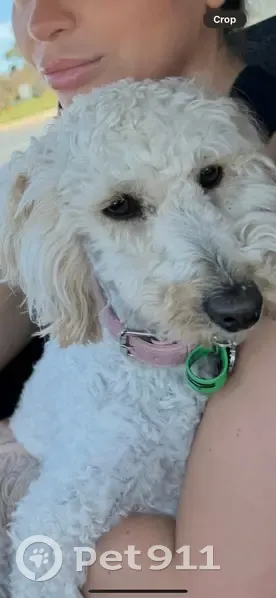 Dutchess is a white toy poodle. She is very friendly but is also a very anxious dog. She disappeared Friday, 19 December around 3 pm. The front door was accidentally left open and then closed shortly after not knowing that Duchess was out the front She doesn’t respond well if you run after her as she thinks it’s a game and will continue to run. It is best to approach Dutchess very calmly and slowly if there are multiple people around trying to chase her down she most likely will not respond well and continue running away.