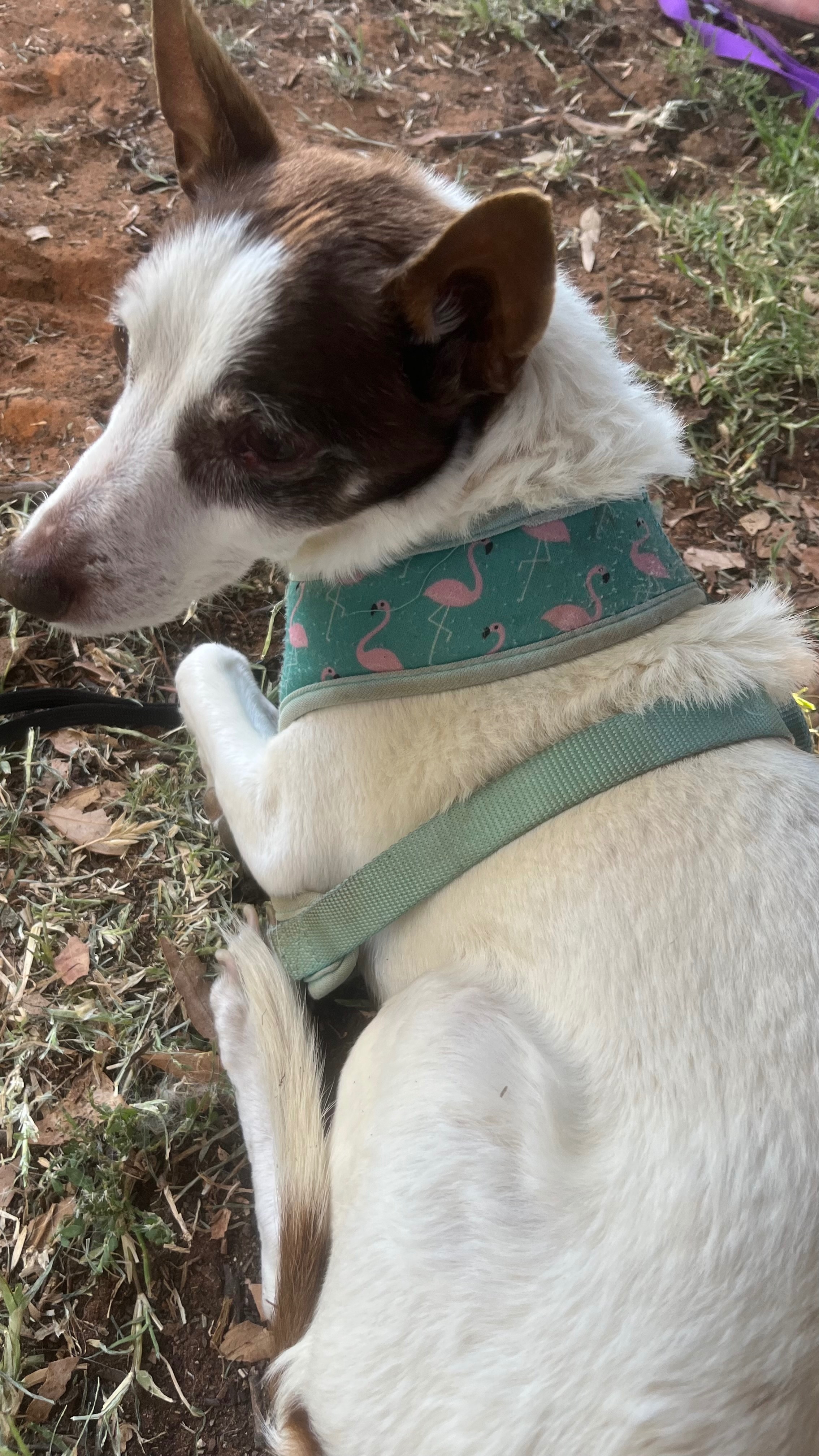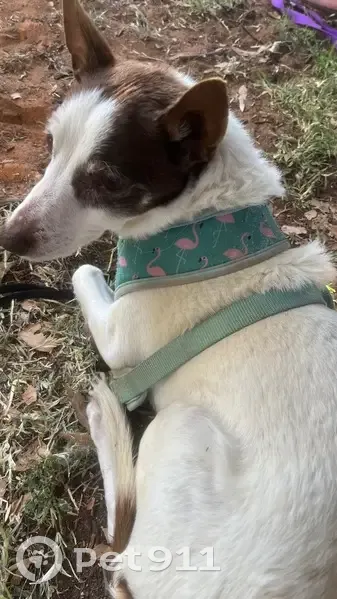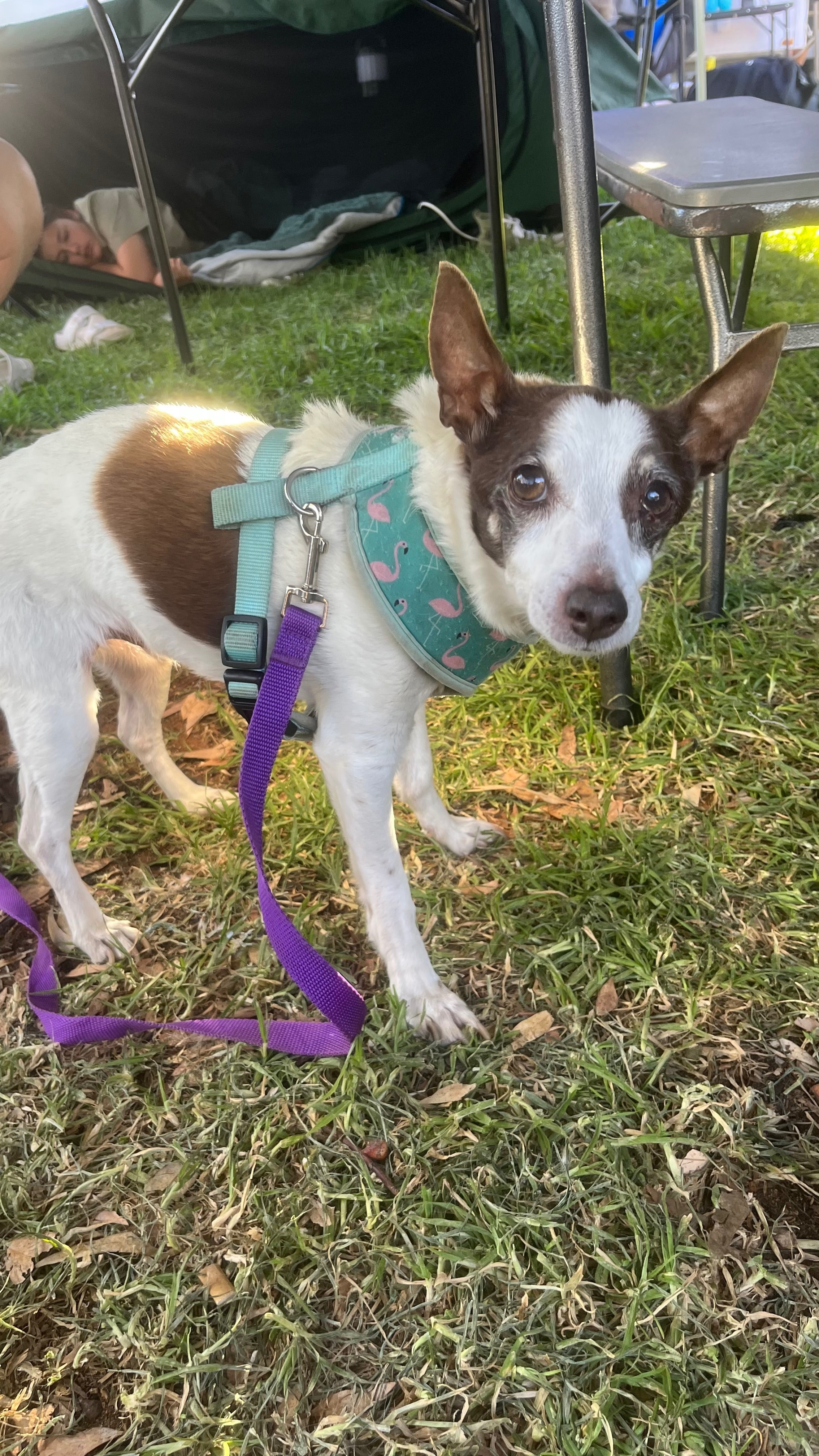 Max is a white short hairs jack russell with dark brown patches and ears. He is 15 years old and has grey hair on his face. He has a faded blue collar that gets hidden in his fur. He his extremely timid and frightened of others and will growl. He snuck out of the tent as we left to go to the toilet this morning without noticing.