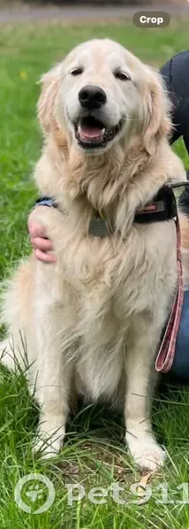 Cream & gold golden retriever, brown eyes with dark eyeliner look around them & blond lashes. 8 years old, collar with tag. Has recently developed symptoms of arthritis & early hip dysplasia so may look stiff when moving or have a slight limp favouring front left leg.