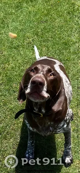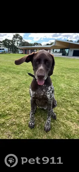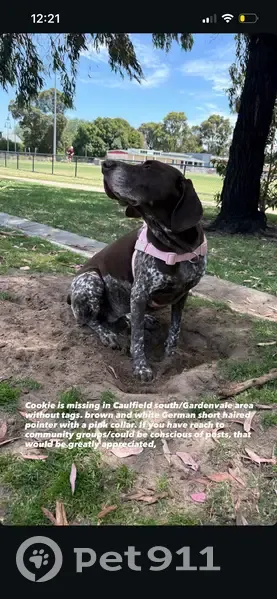 Cookie is chocolate and white with spots. She’s wearing a pink collar and is very friendly