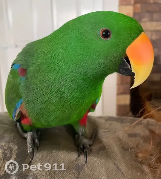 Lucky opened a side door on his new cage and let himself out. He is a large green eclectics with a mango coloured beak. Additional colours under his wings. He talks and copies other birds calls. He is a beloved pet.