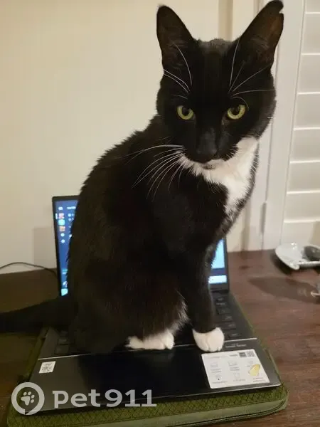 Mostly black coat and white patches of fur (paws, chest, stomach). Green eyes. He is microchipped, desexed, 12 years old. Unlikely to approach strangers, he is very cautious and skittish. Doesn't have a collar. The tip of his left ear is slightly clipped.