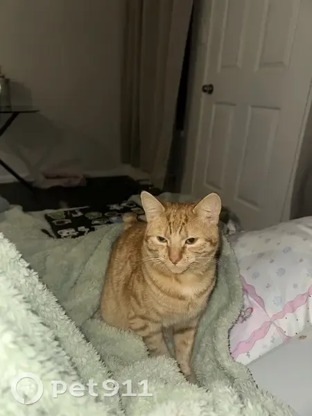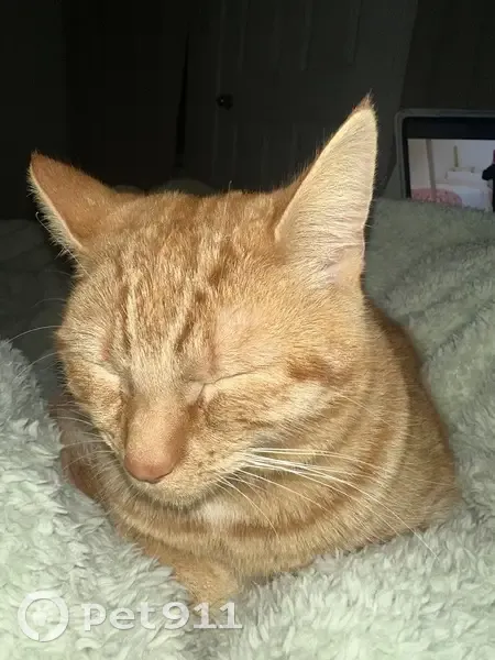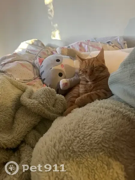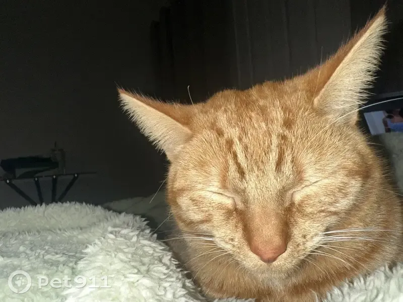 He is a ginger american short hair cat. He has a little scar or freshly healing scar under his left eye.