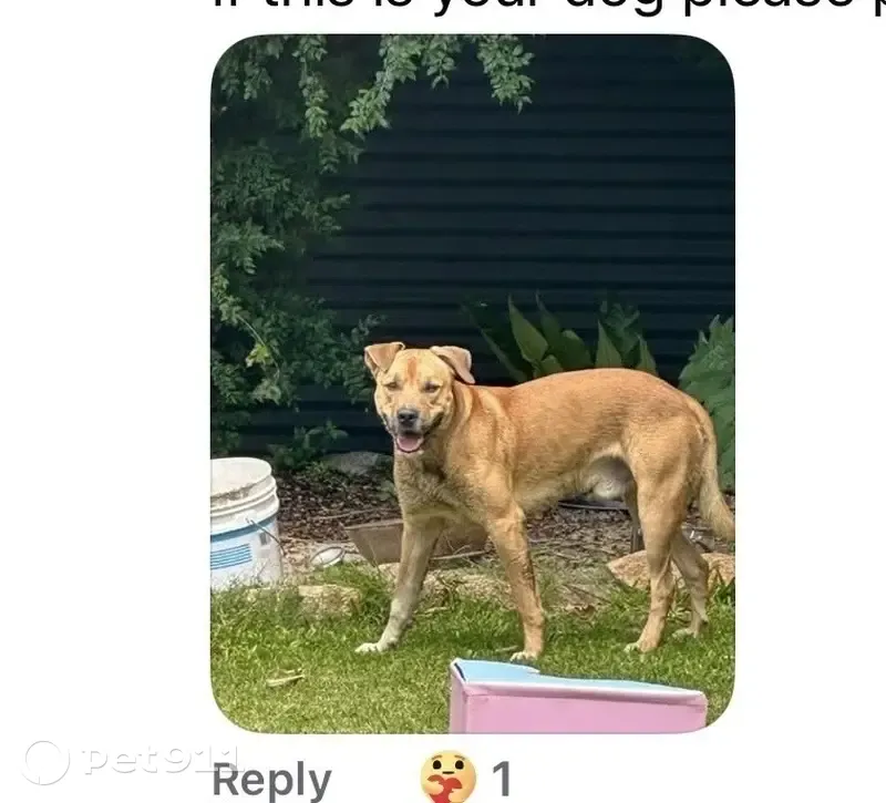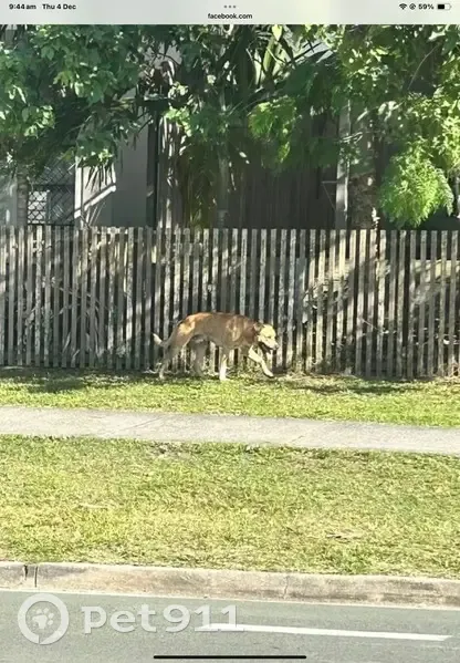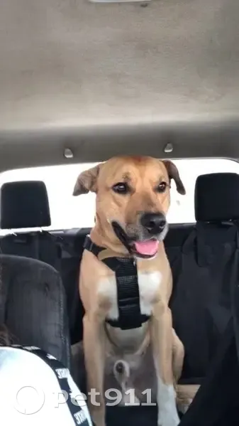 Golden with white feet and white tip on tail. Dew claw on one back foot. No collar on.