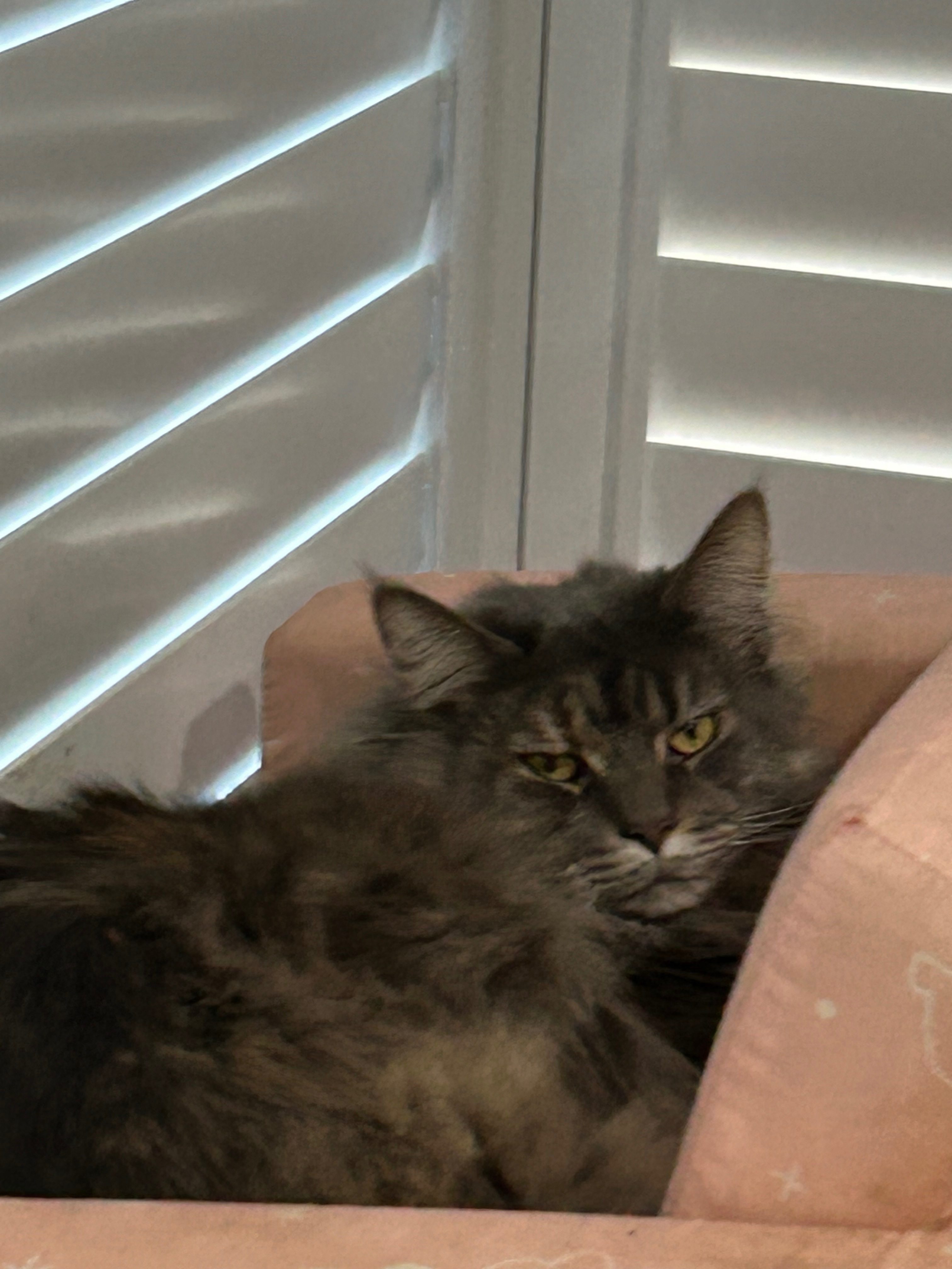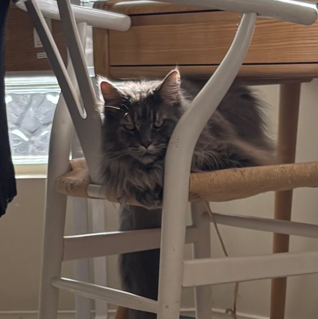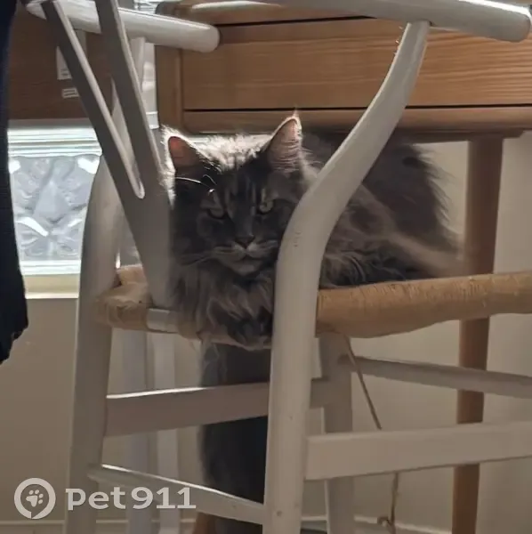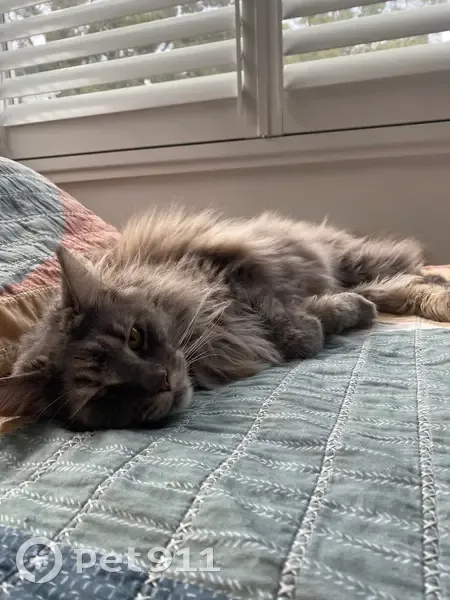 Got out from garage. Never been outside. Inside only. Very timid. Doesn’t like to be picked up. Very fluffy grey blue Maine Coon. Long bushy tail. Grey white fluffy bulgy tummy.