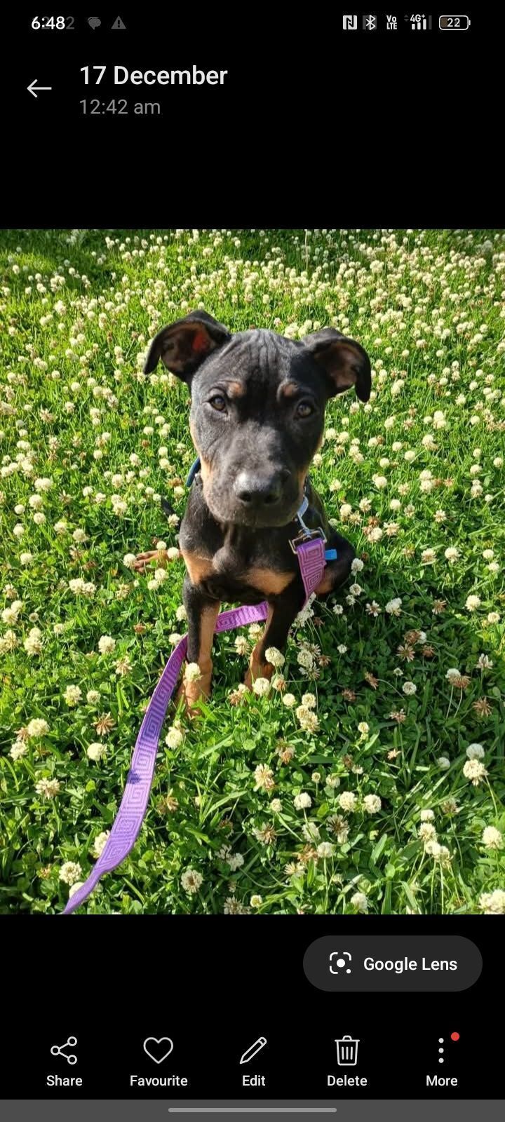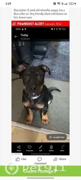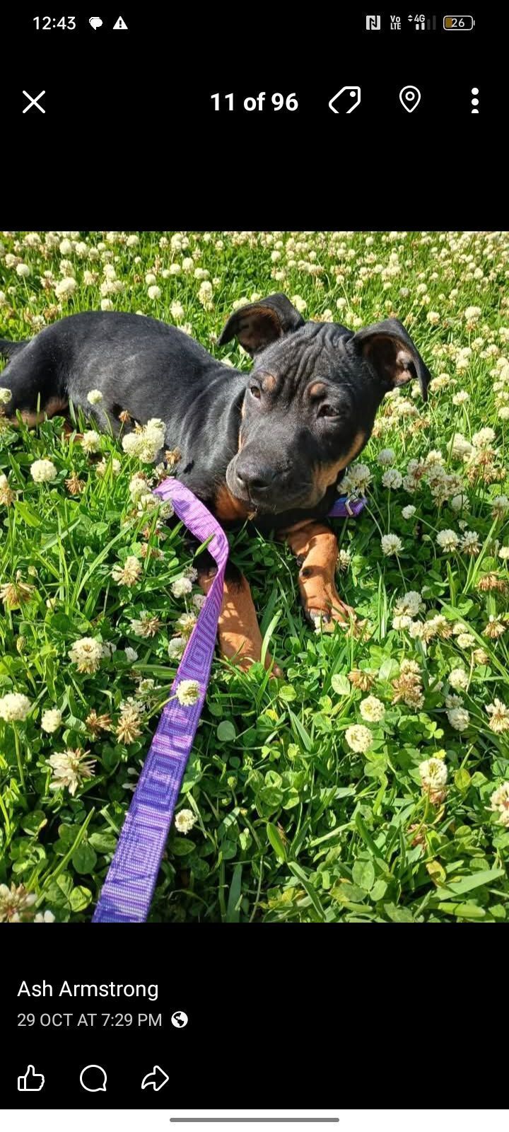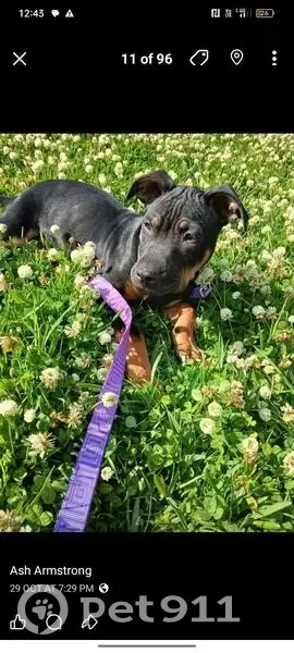 Age at time photographed: Approximately 8–10 weeks old (puppy) Size: Small–medium puppy, sturdy build for age Coat colour: Predominantly black base coat, Distinct tan/brown markings: Above both eyes (tan “eyebrows”), On cheeks and muzzle sides, Chest, Lower legs and paws Coat type: Short, smooth coat Eyes: Brown, round and expressive Ears: Semi-floppy / half-pricked Slightly folded forward at the tips Head & face: Broad forehead, Short to medium muzzle, Noticeable forehead wrinkles when alert, Symmetrical facial markings Body markings: Tan markings are symmetrical on front legs, No white markings visible (except possible small chest marking depending on lighting) Tail: Medium length, Carried straight or slightly curved upward Collars / accessories last seen: Blue collar, Purple leash and harness Overall appearance: (Staffordshire Terrier Cross mix) Appears Rottweiler-type or Staffy-type mix, not a purebred Rottweiler. (Has been mistaken to be just a rottweiler to some vets/council organisations so could have been mistaken as another dog) Stocky puppy build rather than slim Calm, attentive expression; appears friendly and people-focused. Bolt is a very well behaved dog, he loves to be by your side at all times, kind of a fussy eater at first, loves any red meat rather than dog food sometimes. He has been missing since the 10th of October so he will look older now. His eyes always makes him look sad. He has a lion like stance and you think of simber from the lion king when he sits. He sleeps on his side either spread out (as seen in photos) or curled up with his legs and head tucked in. He is familiar with being in a car and is fine in a moving vehicle, he will either lay down or sit, doesn't like really being up at the window while driving (only sometimes), he is a very curious dog and very adventurous. He is now suspected to be in a organisation/rehomed. He is sadly sadly missed and we just want him home. I have his microchip number to verify him. Anyone who has information please call Ashley on 0452234142. There is a reward for any information and location... We won't stop until he is home. Please help us.