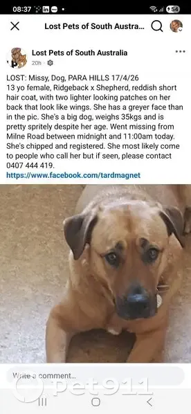 Red wheaten coat, grey muzzle 12 years old Rhodesian ridgeback shepherd. Big girl, 35 kgs. Got out of back yard fence on Sleep/Milne Road Para Hills on early Friday morning (2am to 10am). She's not socialised with dogs and most likely won't come if called by a stranger. I really need a sighting report. This is day 2 early evening