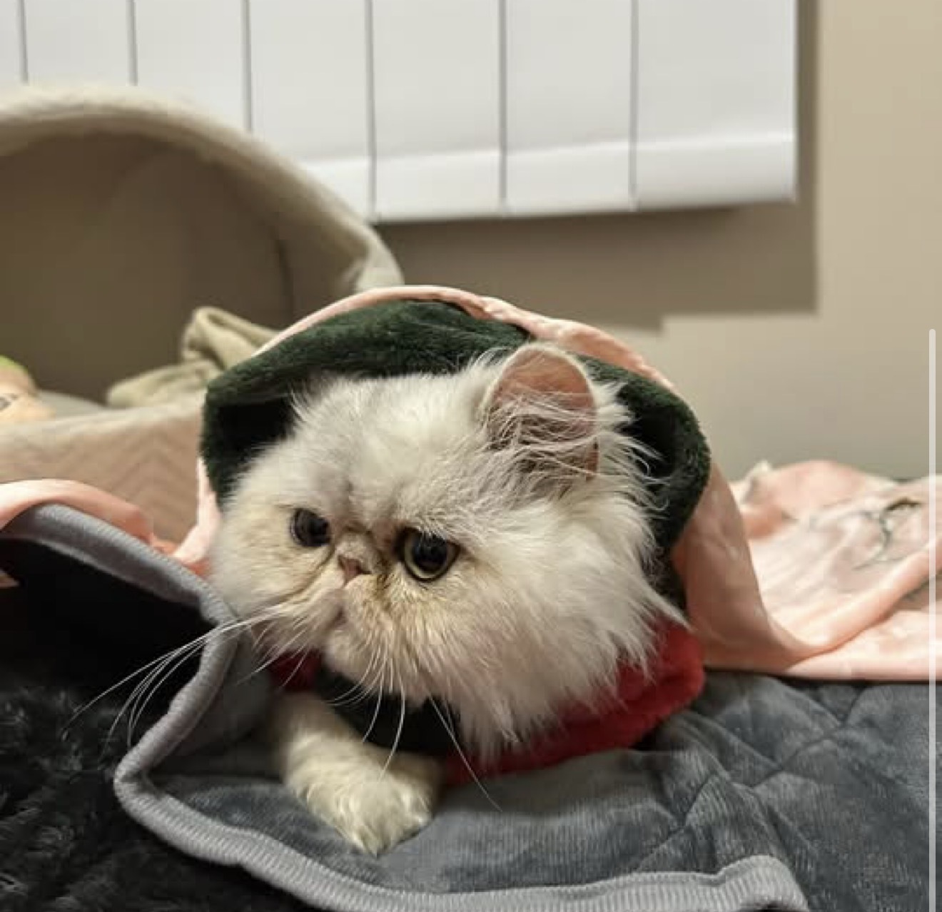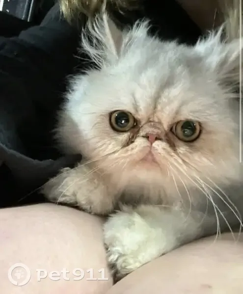 Fluffy and white , big yellow eyes, has strange gremlin like cat noises, will be sociable to be picked up , loving and gentle very domestic , green collar