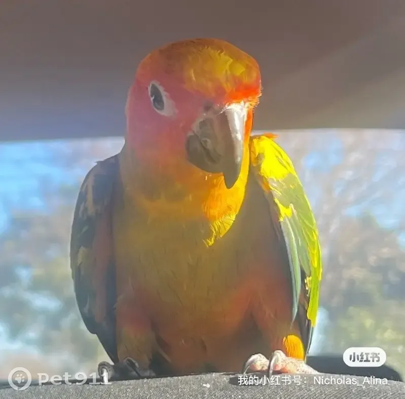 Lost pets Brisbane, photo: Lost Sun Conure: Bright Orange & Green