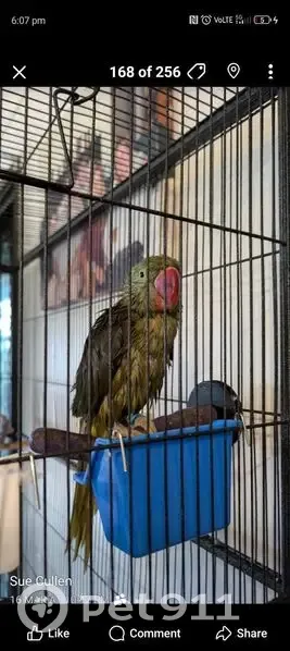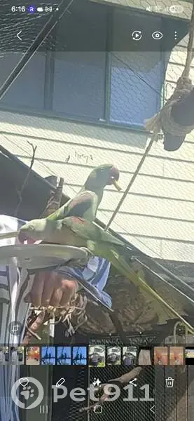 12-15 month Alexandrine just started to get his neck markings. So a splattering of red and black feathers No leg ring ( he ate it). Gentle boy. Growls when you try to pat him but does not bite.