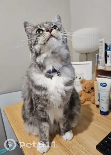 Deva is a female 9yr old grey and white tabby with brown patches, white socks and yellow green eyes. She has a blue punk collar with a fish shaped tag with her name on it. She is an indoor cat and has somehow figured out how to use the doggy door and gotten out. She is friendly but can bite/scratch if she doesn't know you or is scared. She will be very scared. She has skin allergies and stomach issues that require regular visits to the vet. She is my whole world. Please help me find her. She has been missing since Monday evening (6 Apr).